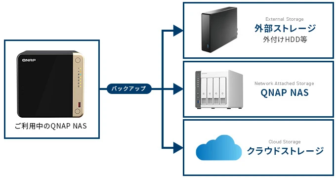 QNAPÀ½NAS¤Ç¤Ï¡¢³°ÉÕ¤±HDD¤Ê¤É¤Î³°Éô¥¹¥È¥ì¡¼¥¸¤äƱ°ì¥Í¥Ã¥È¥ï¡¼¥¯Æâ¤Ë¤¢¤ëÊ̤ÎNAS¤Ë²Ã¤¨¡¢Âбþ¤¹¤ë¥¯¥é¥¦¥É¥¹¥È¥ì¡¼¥¸¥µ¡¼¥Ó¥¹¤Ø¤Î¥Ð¥Ã¥¯¥¢¥Ã¥×¤â¹Ô¤¨¤Þ¤¹¡£ÌÜŪ¤ä±¿ÍÑ·ÁÂ֤˹ç¤ï¤»¤Æ½ÀÆð¤Ë¥Ð¥Ã¥¯¥¢¥Ã¥×´Ä¶¤ò¹½ÃۤǤ¤ë¤Î¤Ç¡¢°Â¿´¤·¤Æ¤´ÍøÍѤ¤¤¿¤À¤±¤Þ¤¹¡£