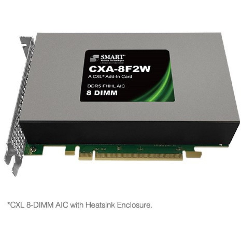 SMARTのCXA-8F2Wは、CXL規格を利用した8-DIMM AICです。これは、フルハイト・ハーフレングスのPCIeフォームファクターモジュールに取り付けられた8つのDDR5 RDIMMから成るType 3 PCIe Gen5アドインカード(AIC)です。合計帯域幅が64GB/sの2つのx8 CXLポートを実装するために、2つのx16 CXLコントローラーが使用されています。